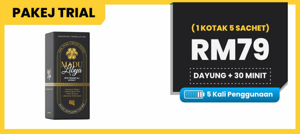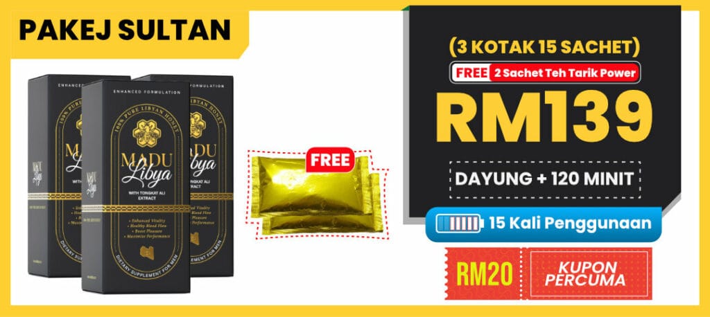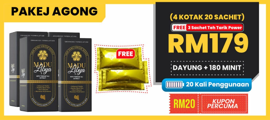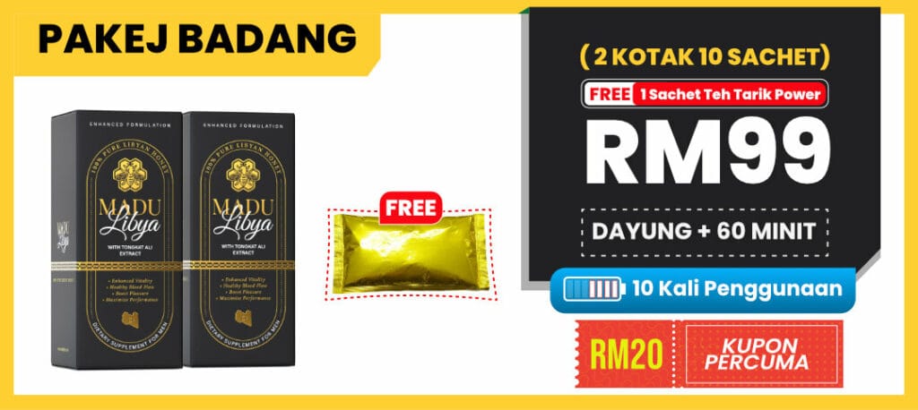 “Grab Madu Libya sekarang & nikmati FREE sachet Teh Tarik Power Sample Produk Baru khas untuk tenaga lelaki. Minum pun sedap, effect pun mantap!”